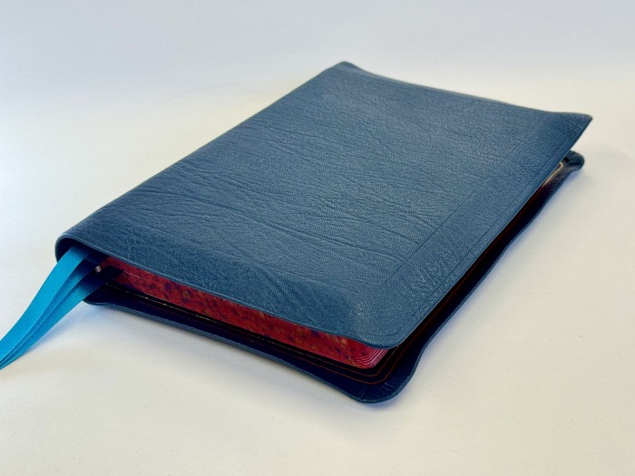 This edition of the Allan NIV Proclamation Bible is bound in Dark Teal Blue Highland goatskin with full yapp, leather lined in matching dark teal blue with double gilt lines inside and three vibrant turquoise ribbon markers. It features antiquarian-style hand-speckled page edges with red underlay and blue, gold and pearlescent speckles and includes presentation pages and family record in Allan’s exclusive design, along with a concordance, 4pp colour maps and 32pp Allan lined notepaper.