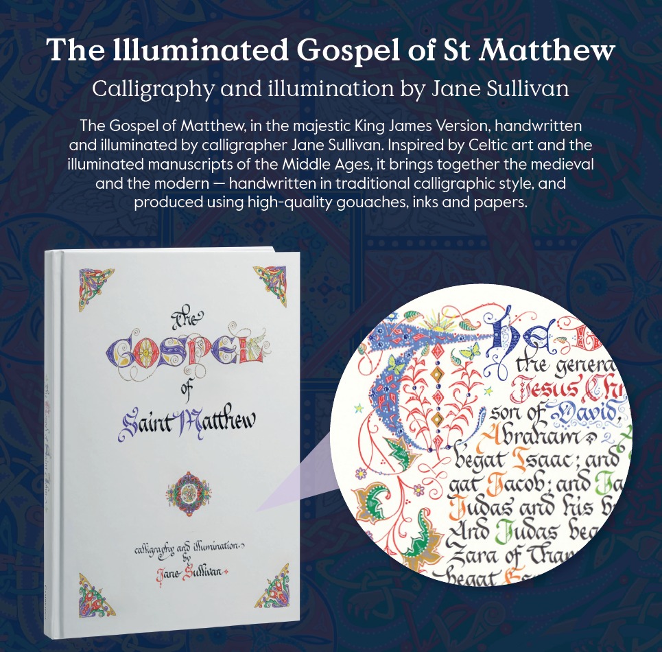 An exquisite fine art edition of St Matthew’s Gospel, illuminated by artist-calligrapher Jane Sullivan. Like the Illuminated Gospel of John, it is inspired by Celtic art and the beautiful illuminated manuscripts of the Middle Ages.