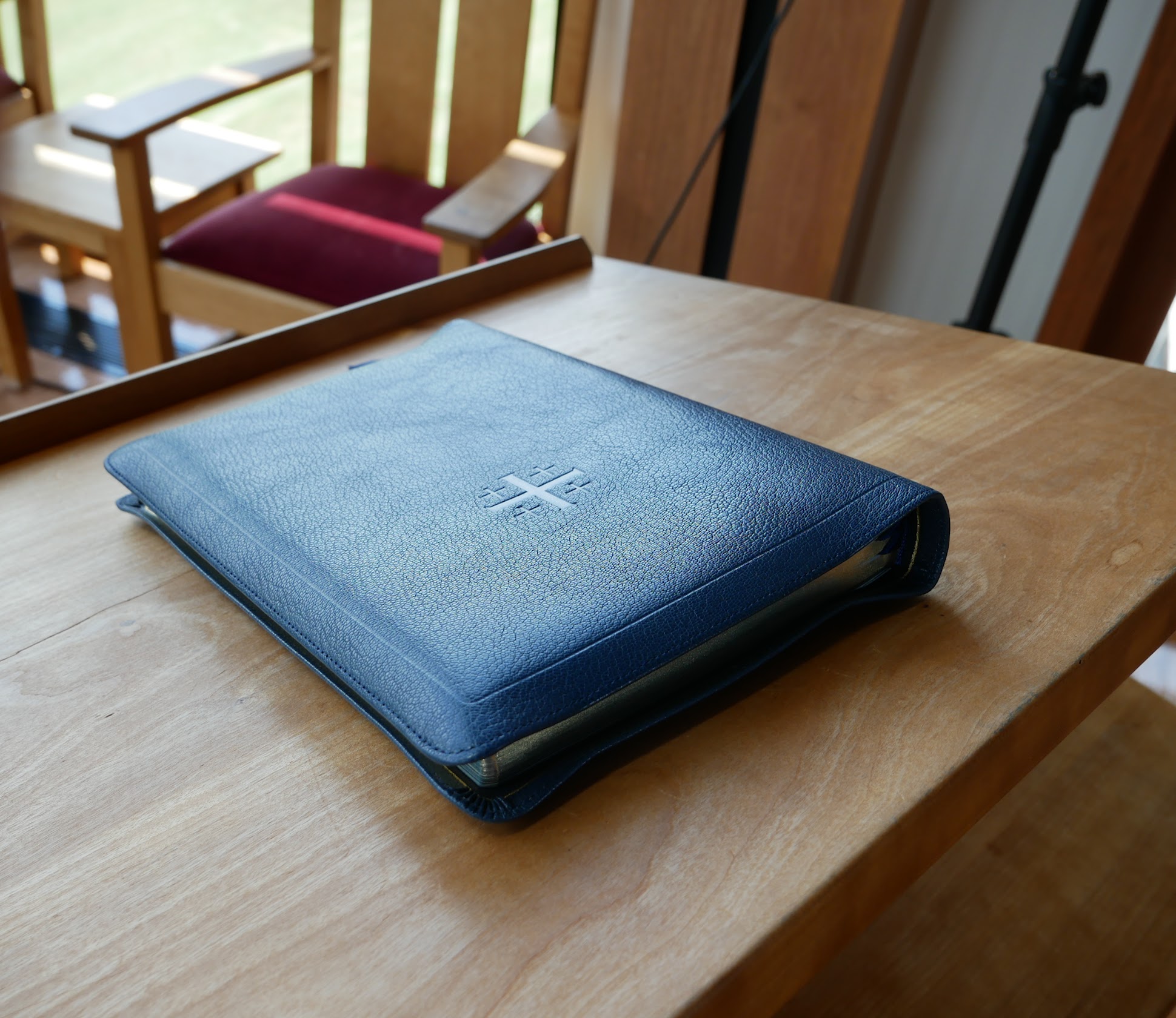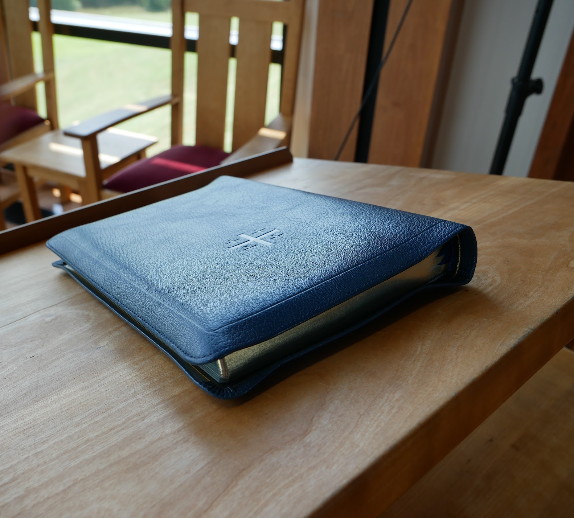 - Full yapp* cuero de cabra Azul Imperial con forro de piel de becerro Azul Marino (*cubierta de cuero que se extiende más allá de los bordes del libro para obtener más protección de sus páginas internas.)