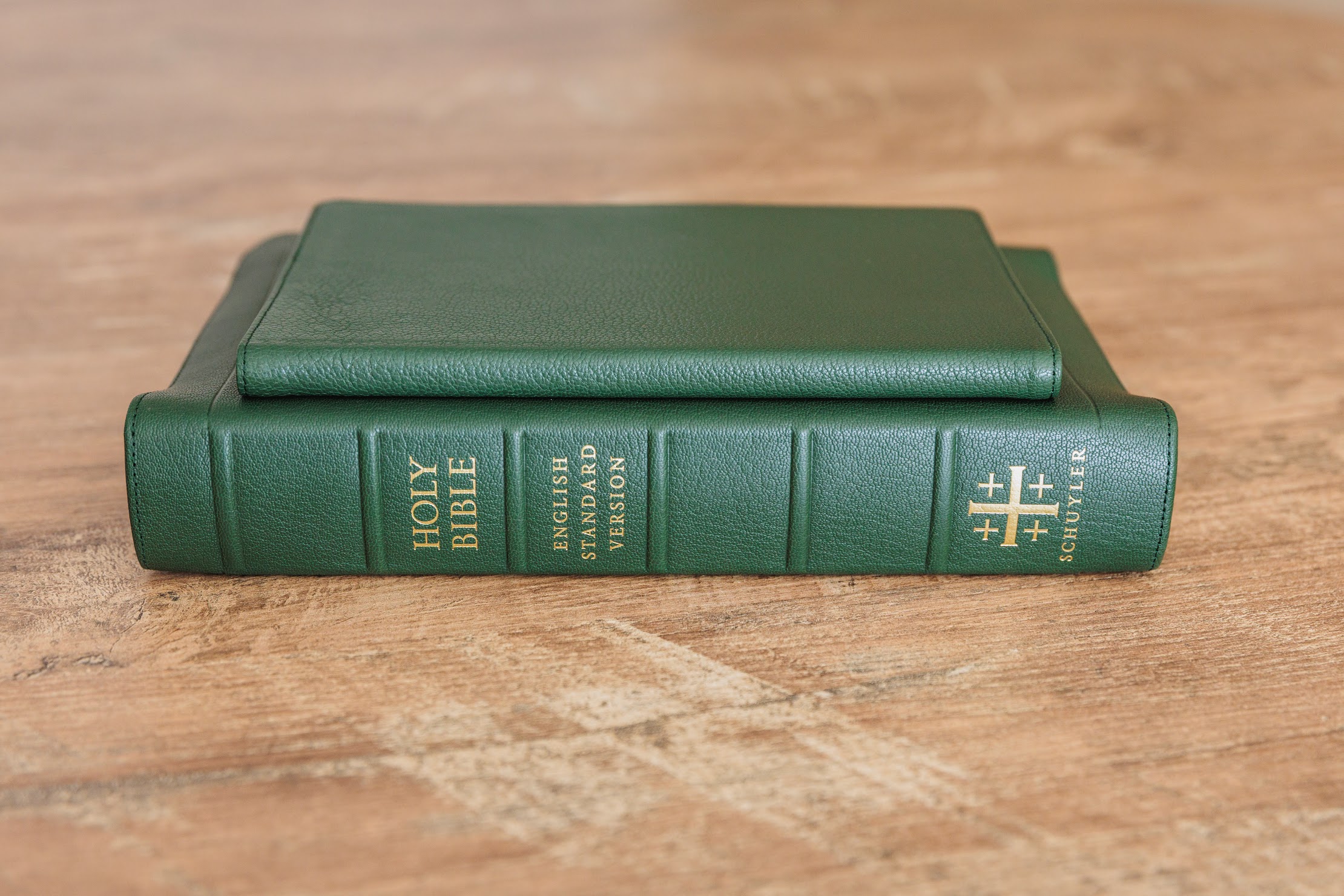 Natural Grain Dark Green Goatskin cover – with matching perimeter stitching.