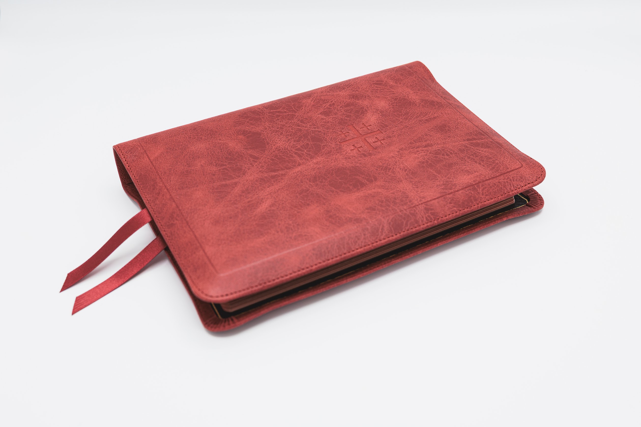 Schuyler Personal Size Quentel ESV, Full Yapp Marbled Crimson Calfskin Bible