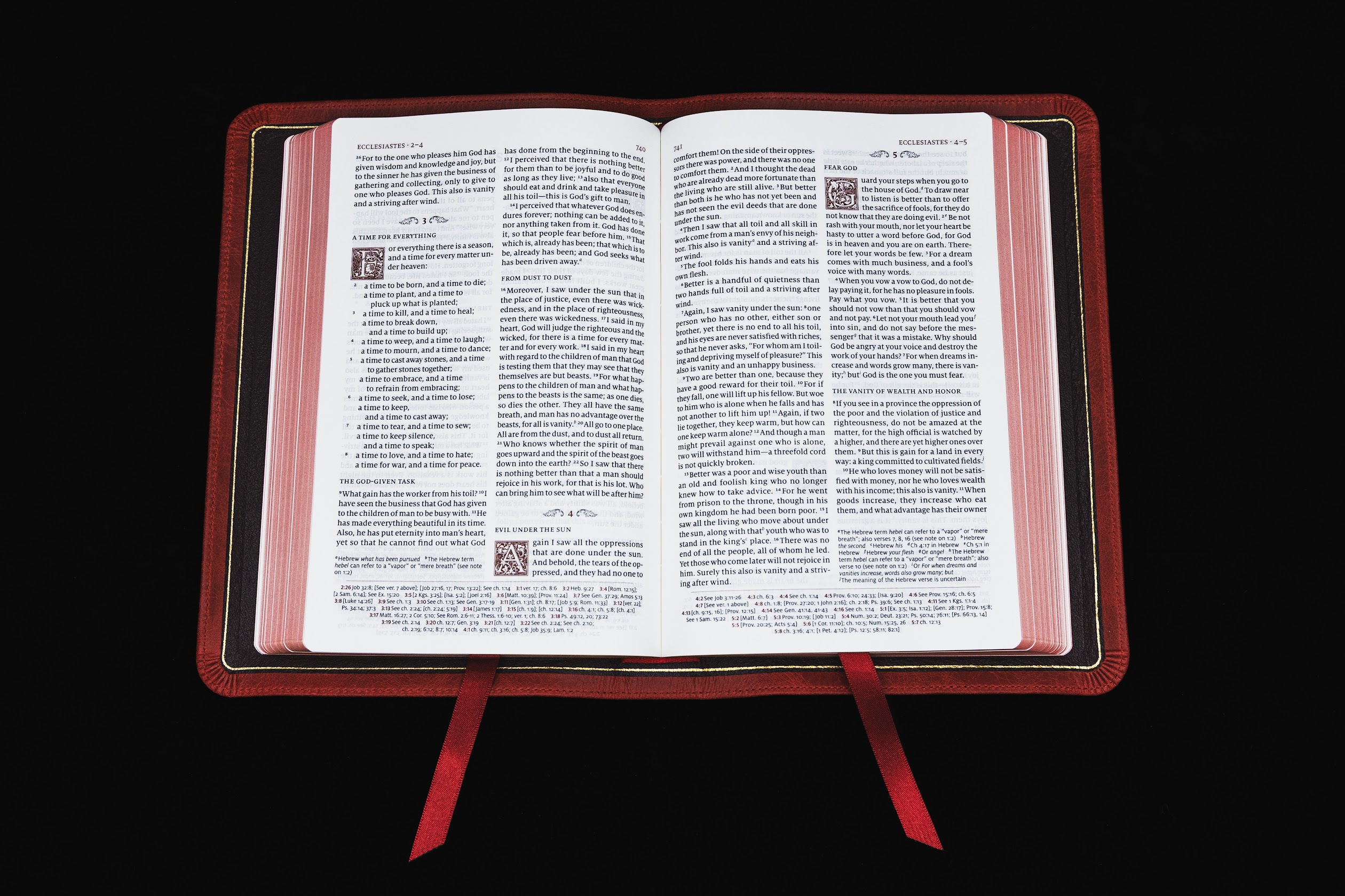 The Schuyler Personal Size Quentel ESV is based on the Quentel Series, which is available in the ESV, NKJV, NASB, NIV, CSB, RSV, and NLT. This edition is designed to be a ‘personal size’ companion to the regular sized Quentel since it is identical in pagination. See a PDF sample (open at 100% or “actual size”).