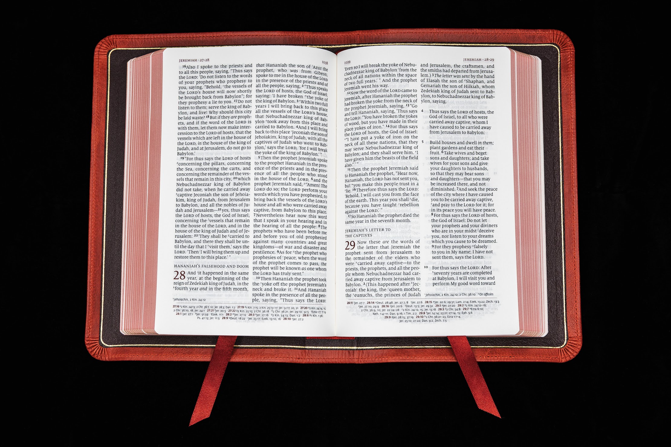 The Schuyler Personal Size Quentel NKJV is based on the Quentel Series, which is now available in the ESV, NKJV, NASB, NIV, CSB, RSV, and NLT. This edition is designed to be a ‘personal size’ companion to the regular sized Quentel since it is identical in pagination. CLICK HERE for a .pdf sample (of NASB; open at 100% or “actual size”).