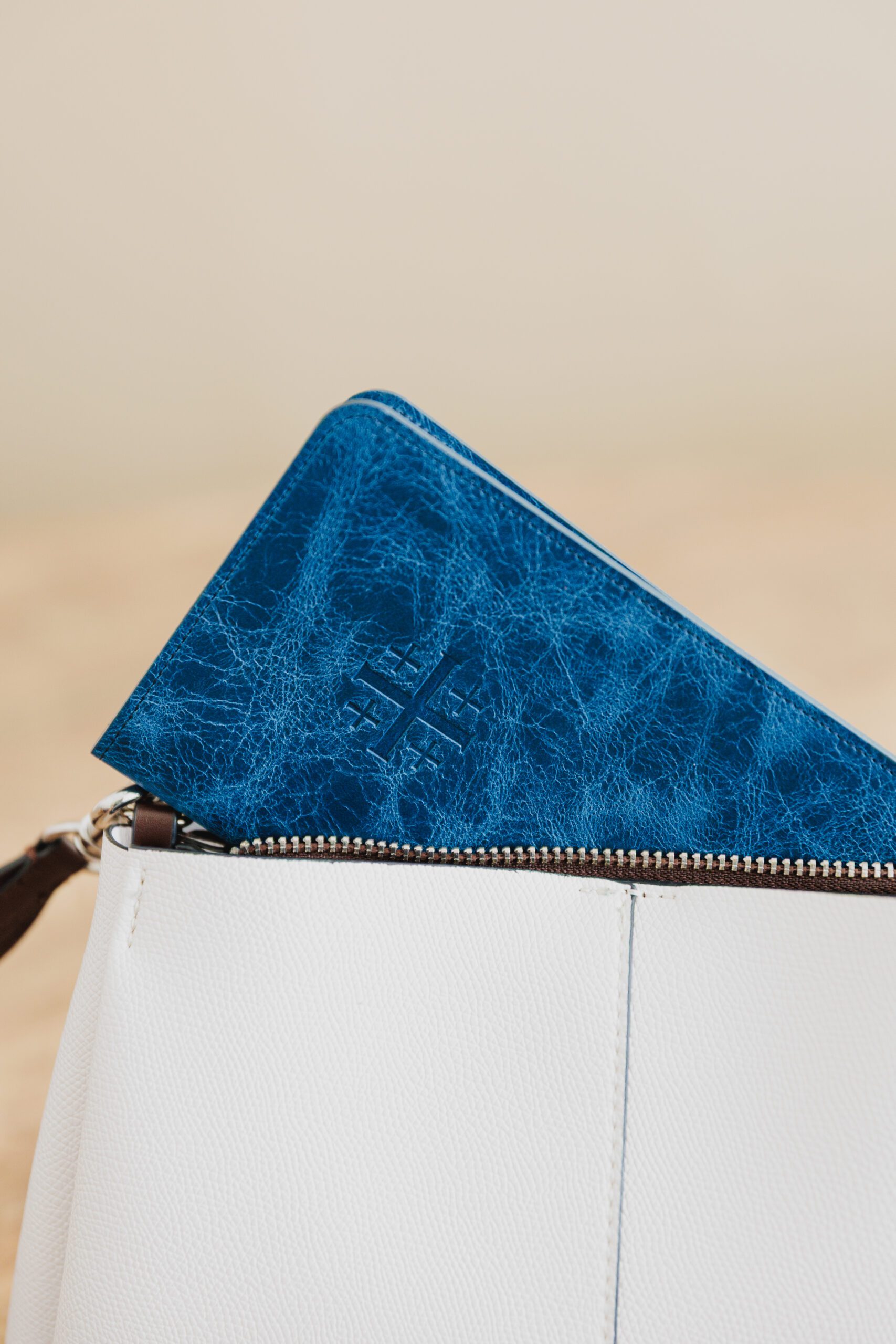 Marbled Sapphire Natural Grain Calfskin cover with matching perimeter stitching