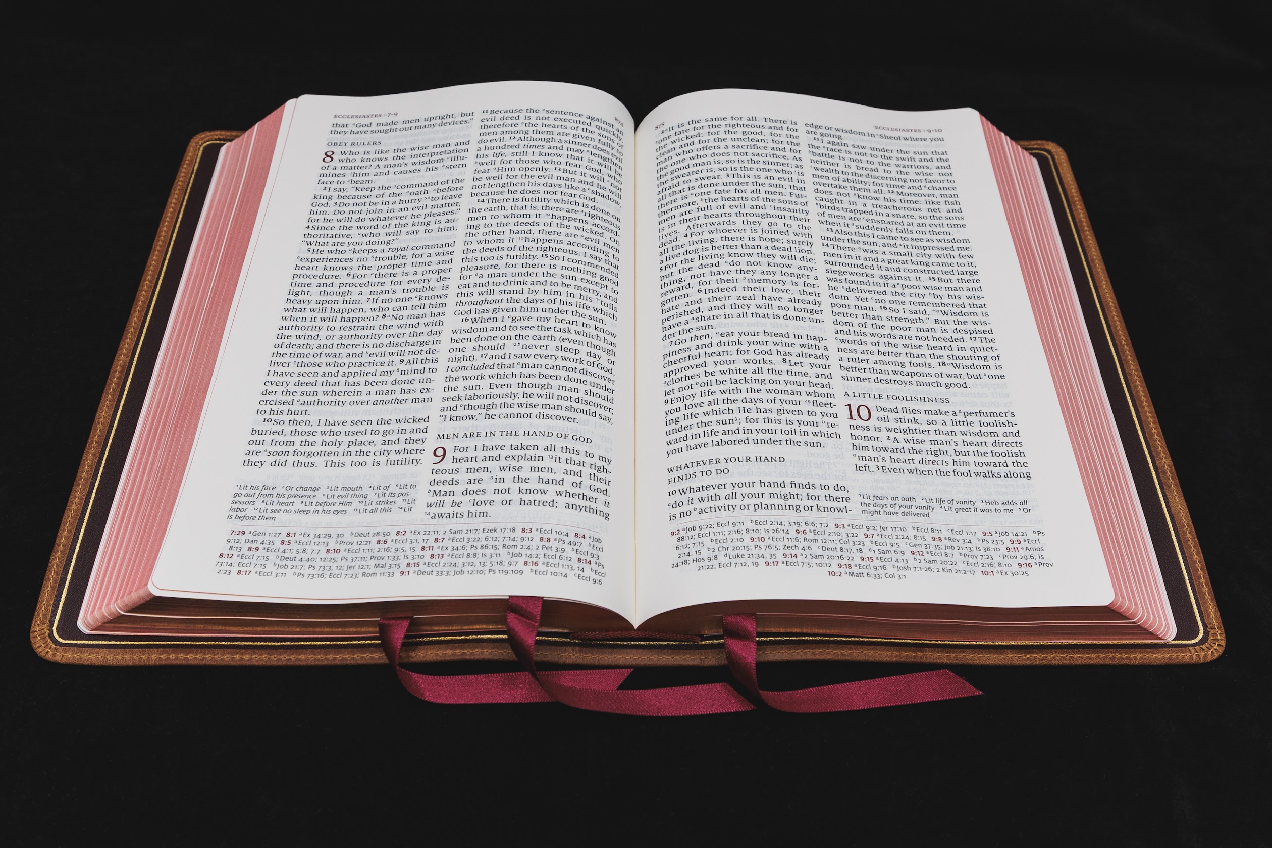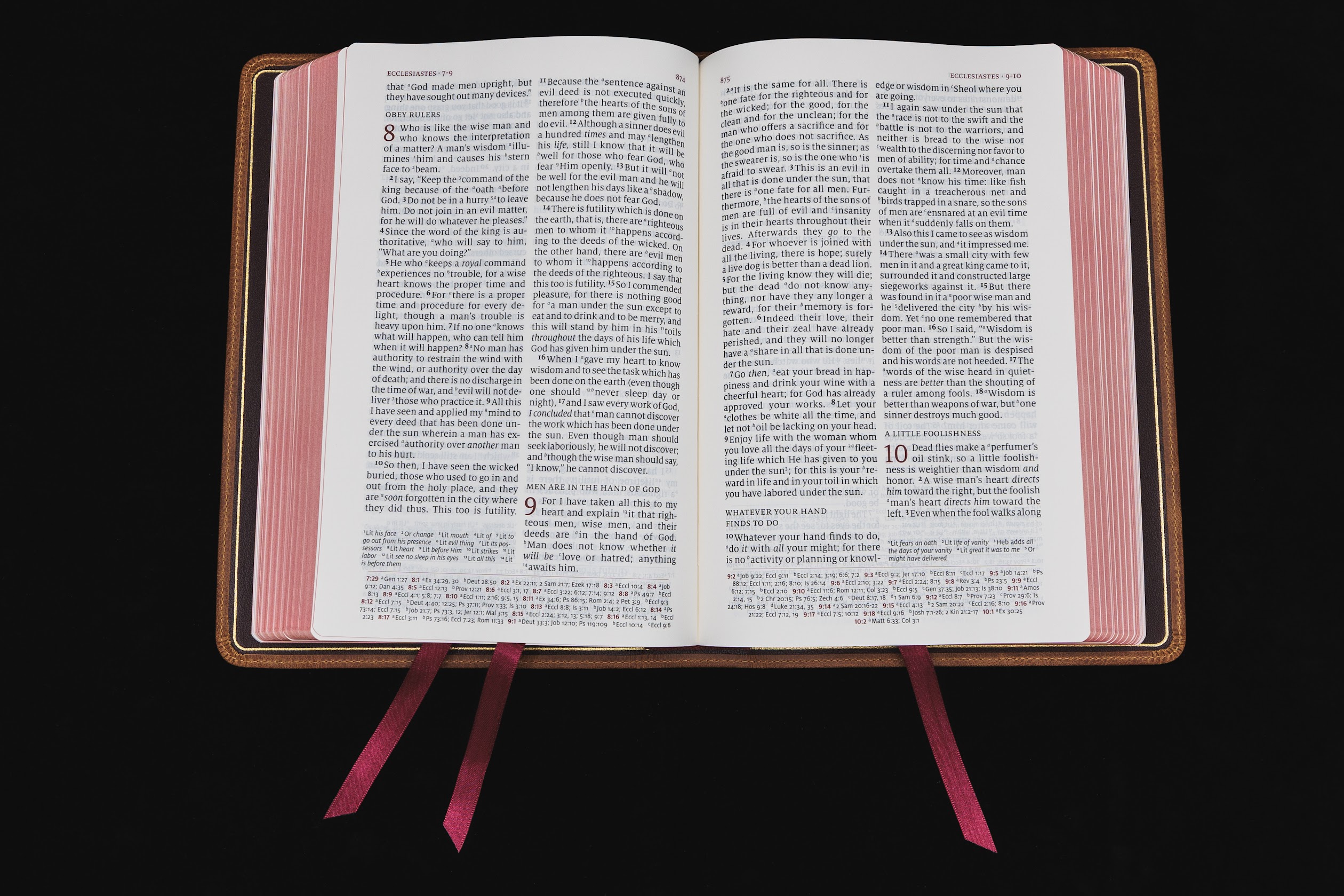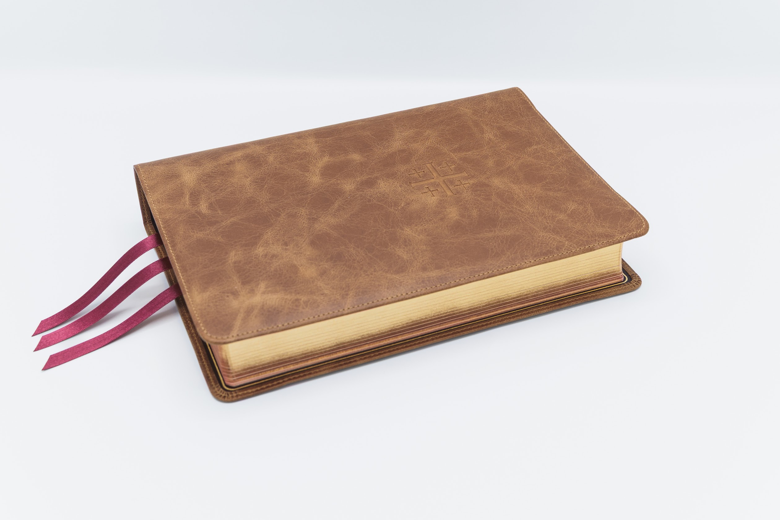 3 burgundy ribbons with red under gold page edges
