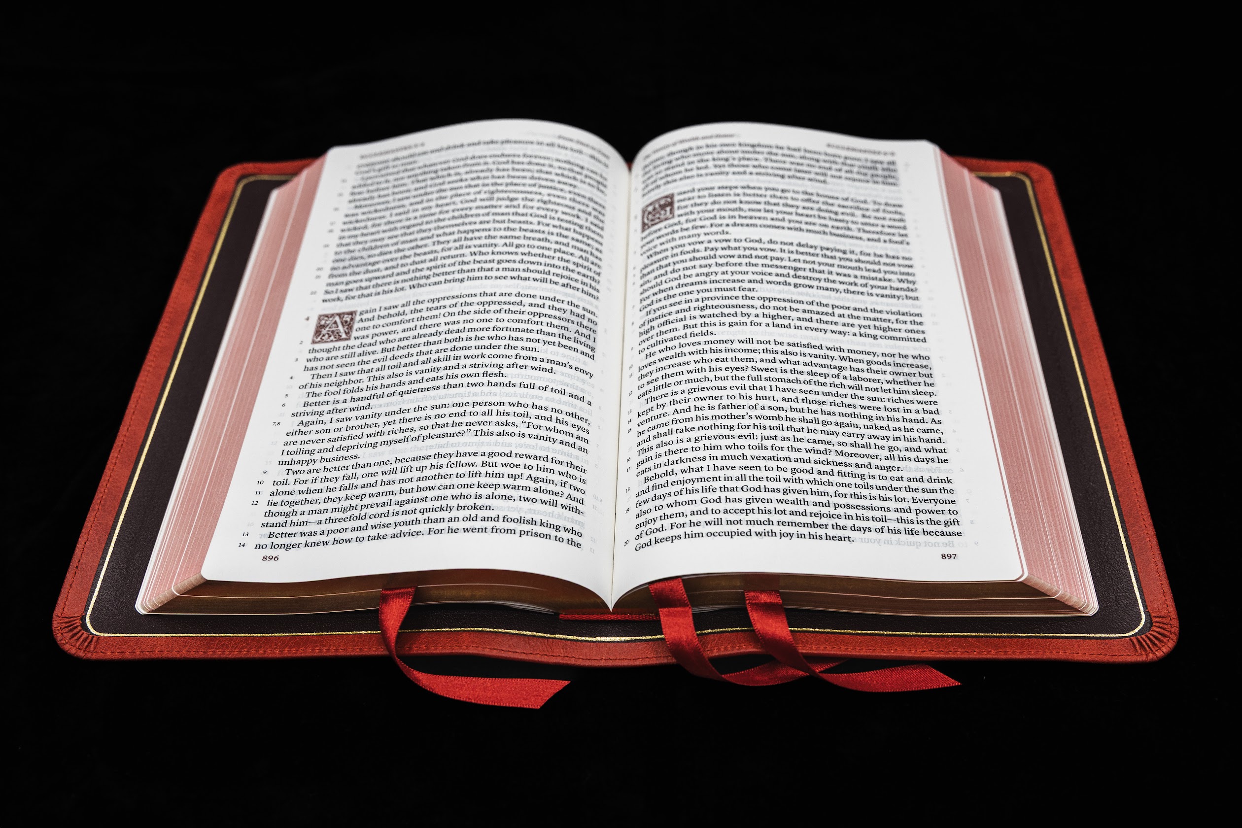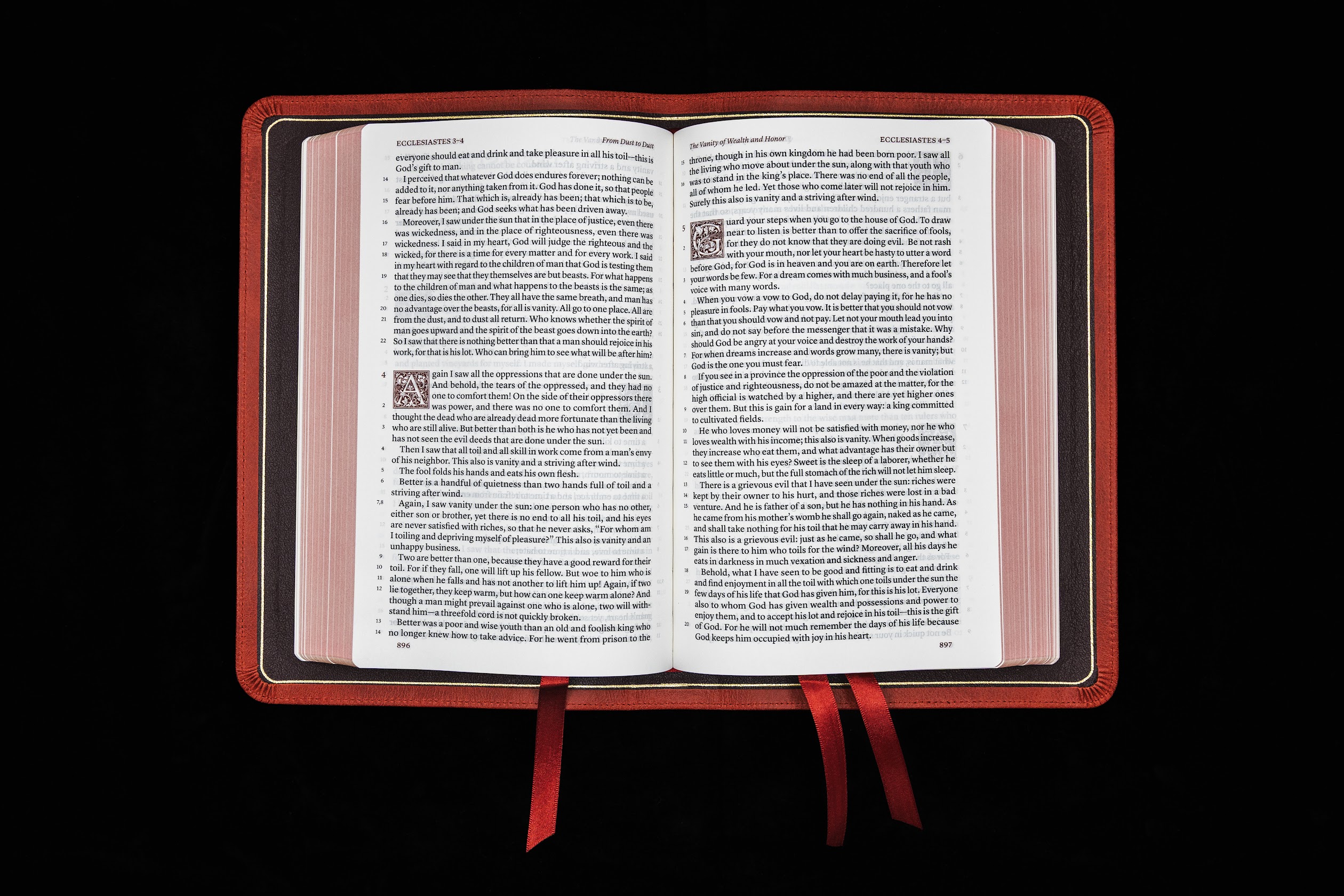 This brings it all in one package. A bit heavier than the PSQ and slightly larger footprint, but not by much. The 10 point font is bolder than the PSQ (originals) and is very easy to read. No bleed through. Generally I like a 2 column approach better but I loved the Crossway and this is very much like that, so no problem there. The ribbons are nice, only wish they were a bit thinner, and the one is pinched a bit at the top – which I have had happen before on high end Bibles. The crimson aniline distressed leather is very soft and pliable and a bit lighter than what I had hoped for but that can be darkened a bit. I do like the red as a switch from black and browns. The texture is noticeably more distressed on the front than the rear but is really only noticeable if one bends the cover backwards. It is just a bit thicker in the book block than listed on the description – maybe a 1/16″. The yapp is generous to say the least but I like a full yapp for protecting the edges when carrying or transporting. The overall footprint, not counting the yapp, is nearly the same as the original PSQ.